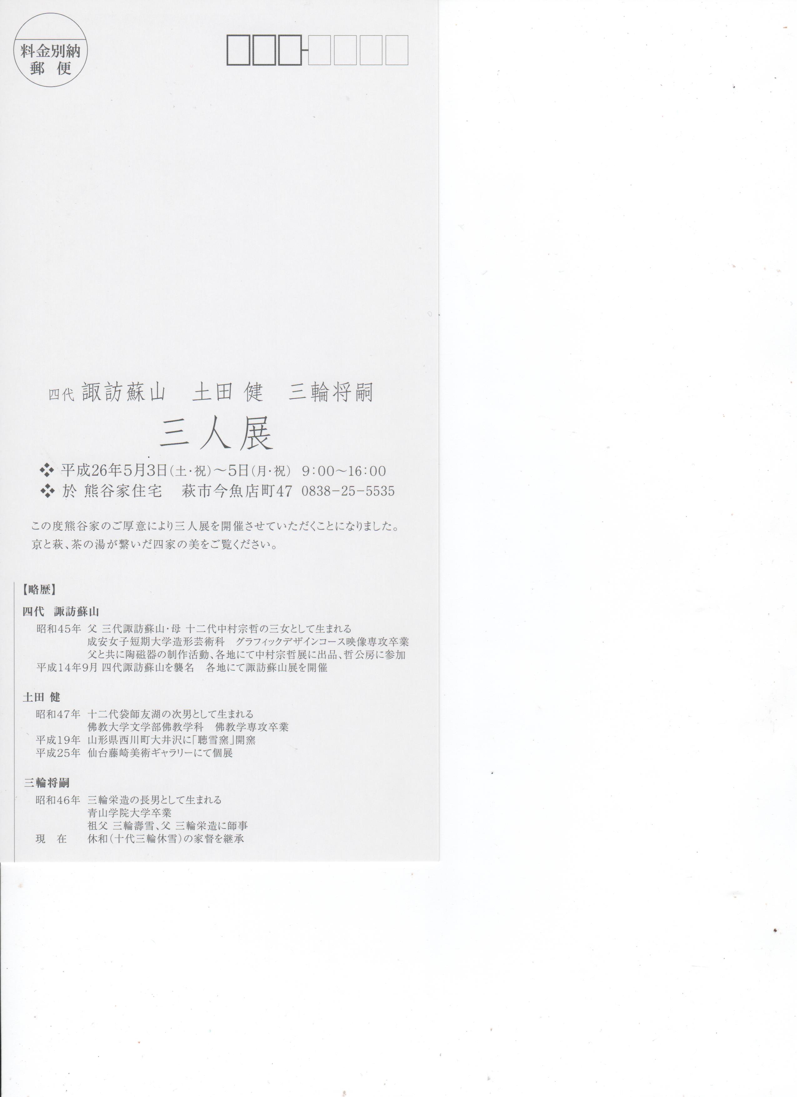 展示会のご案内です 投稿日時: 4月 15, 2014 投稿者: chousetsugama コメントする 様々なご縁をいただいて、この度萩にて三人展を開催する運びとなりました。 会場であります「熊谷家」は、私のご先祖さまが百数十年前にお世話になった家でもあります。 また、萩と京とを代表する焼き物の名家に挟まれ、大変恐縮していますが、 今の自分を皆さんに見ていただけたら嬉しく思っています。 もし、まだ連休のご予定が空いてましたら、萩に足を伸ばしてみませんか? 会期中は、萩焼祭りや萩大茶会も催されます。 沢山の方のお越しをお待ちしています。 聴雪窯 土田 健 共有: X で共有 (新しいウィンドウで開きます) X Facebook で共有 (新しいウィンドウで開きます) Facebook LinkedIn で共有 (新しいウィンドウで開きます) LinkedIn 印刷 (新しいウィンドウで開きます) 印刷 友達にメールでリンクを送信 (新しいウィンドウで開きます) メールアドレス いいね 読み込み中… 関連